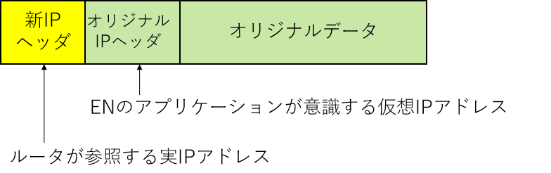 このパケットをデータとみなして、さらに実IPアドレスによるヘッダを追加します。